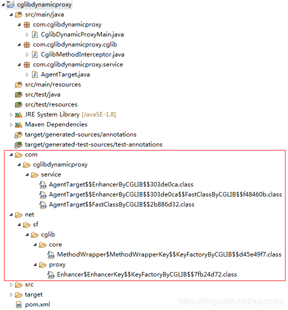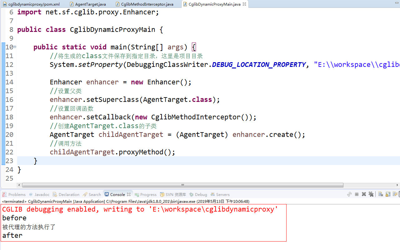 package com.cglibdynamicproxy;import com.cglibdynamicproxy.cglib.CglibMethodInterceptor;import com.cglibdynamicproxy.service.AgentTarget;import net.sf.cglib.core.DebuggingClassWriter;import net.sf.cglib.proxy.Enhancer;public class CglibDynamicProxyMain { public static void main(String[] args) { //将生成的class文件保存到指定目录,这里是项目目录 System.setProperty(DebuggingClassWriter.DEBUG_LOCATION_PROPERTY, "E:\\workspace\\cglibdynamicproxy"); Enhancer enhancer = new Enhancer(); //设置父类 enhancer.setSuperclass(AgentTarget.class); //设置回调函数 enhancer.setCallback(new CglibMethodInterceptor()); //创建AgentTarget.class的子类 AgentTarget childAgentTarget = (AgentTarget) enhancer.create(); //调用方法 childAgentTarget.proxyMethod(); }} 运行如下